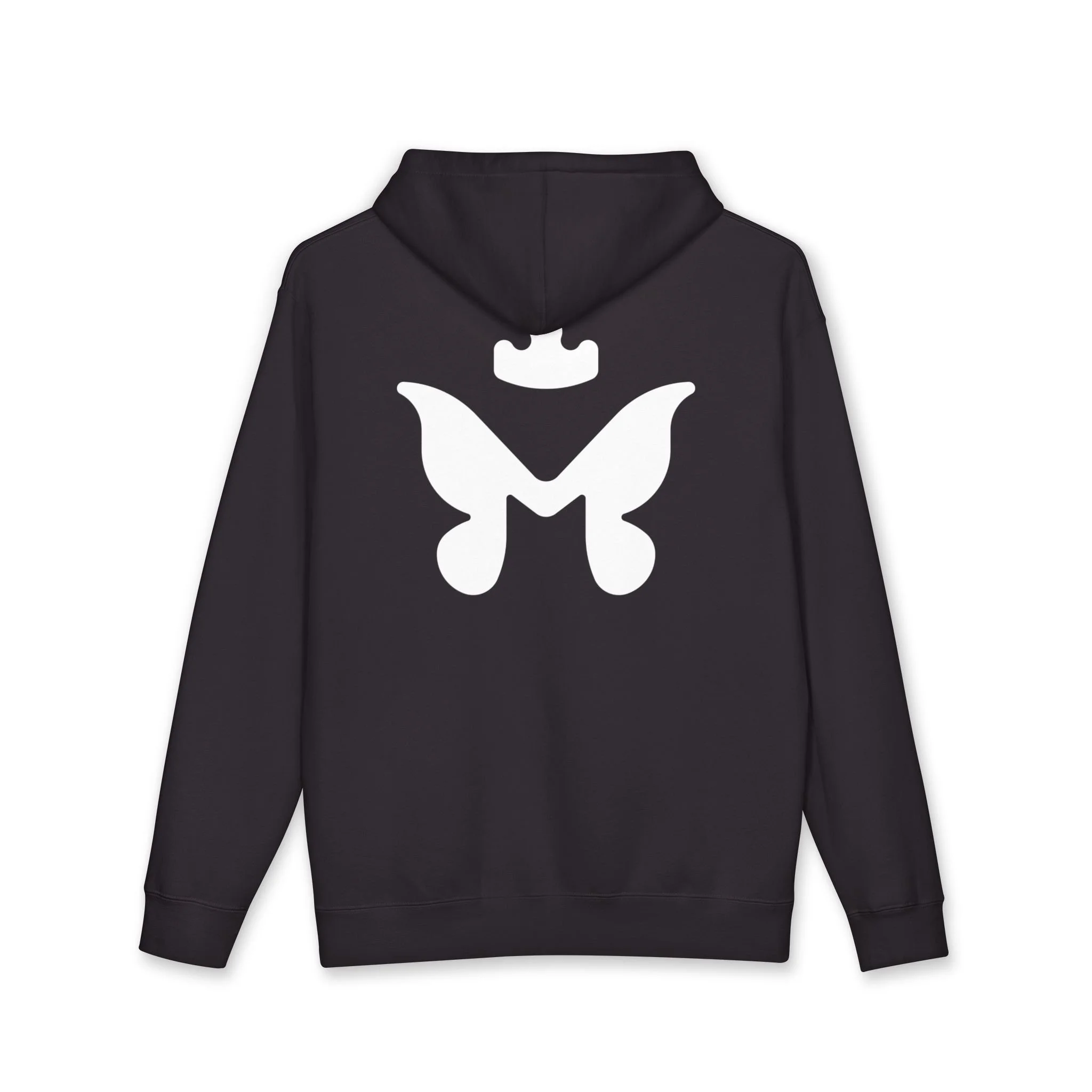 This heavyweight hooded sweatshirt wraps you in quiet confidence. The soft, dense fabric and fleece-lined hood feel substantial and warm without being bulky. A golden, minimalist emblem — a crown-centered butterfly/”M” mark — sits small on the chest and larger on the back, lending a subtle, modern heraldic touch that reads like a personal sigil. Wear it for slow mornings, late-night studio sessions, or when you want an elevated casual look with a hint of symbolism. The roomy fit layers easily over tees or shirts, while ribbed cuffs and waistband keep the silhouette neat. It’s the kind of hoodie that ages well and becomes part of your daily rhythm.