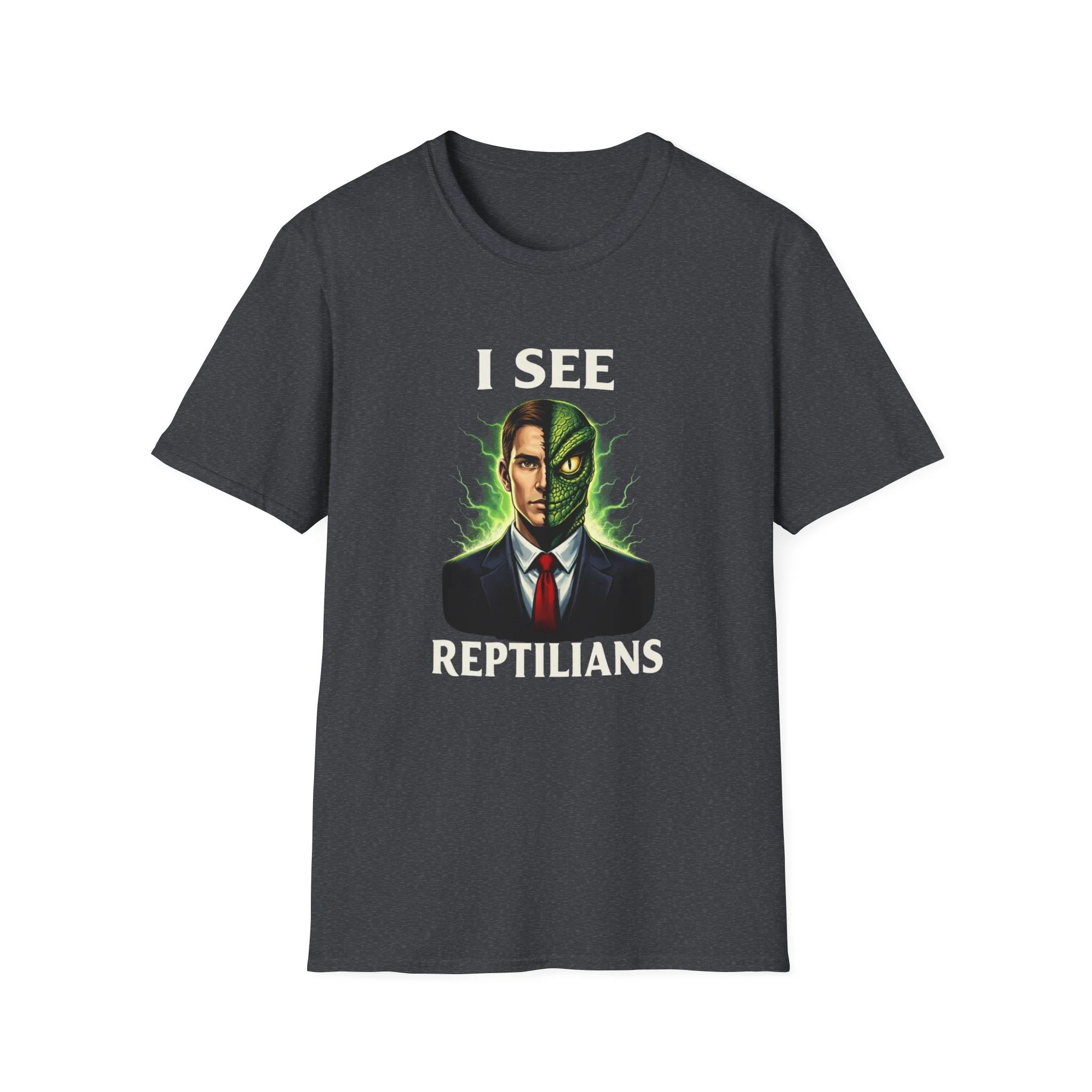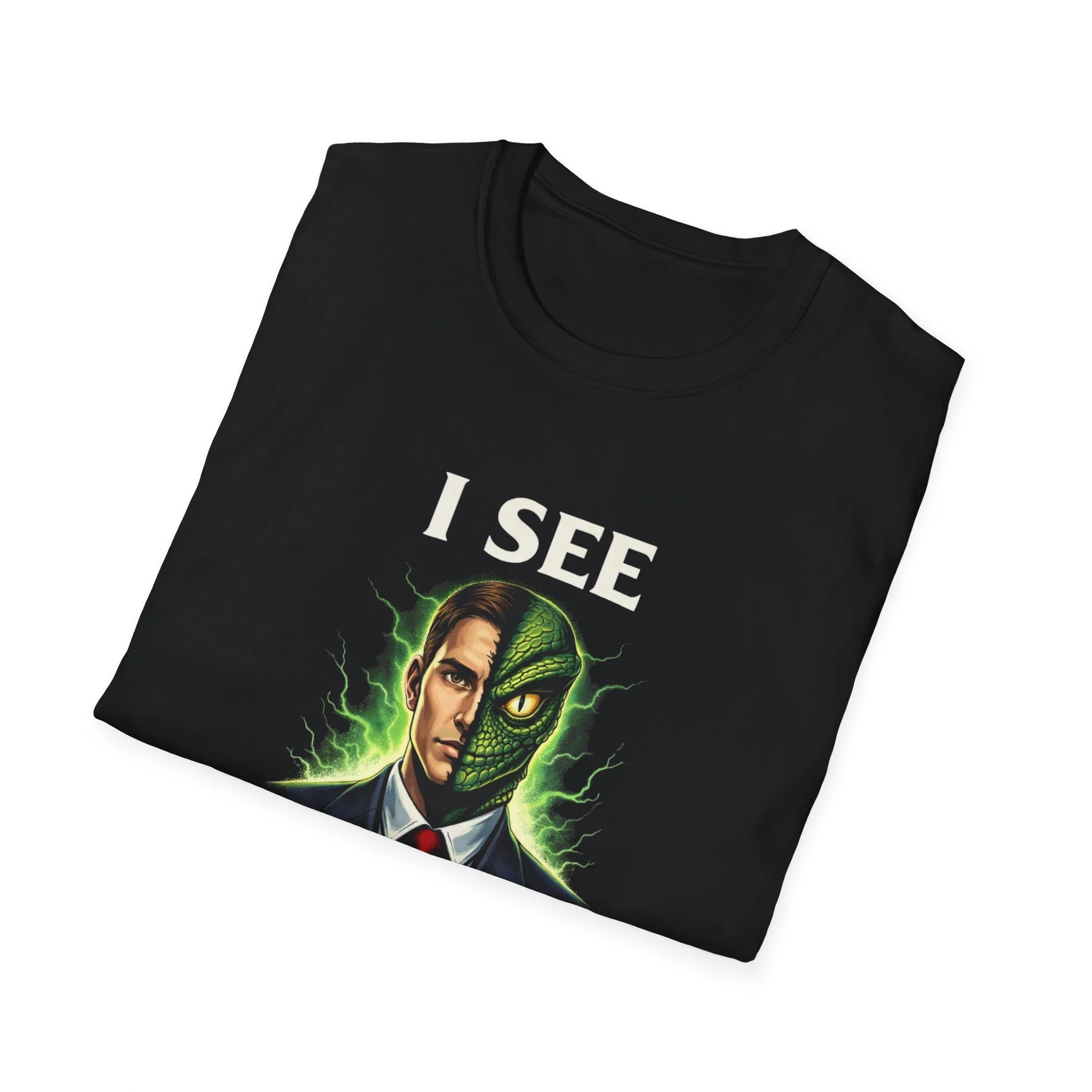 Wear your curiosity on your sleeve—this soft, breathable tee carries a bold, surreal illustration that splits a suited face into human and reptilian halves, framed by green, otherworldly energy. The design feels like a late-night conspiracy unearthed in a neon-lit diner: equal parts uncanny and playful. Lightweight and smooth against the skin, the shirt drapes cleanly with a classic crew neck for everyday layering. It slips into the life of someone who enjoys offbeat humor, speculative fiction, and conversations that wander into strange theories. Pair it with worn denim or a jacket at a meet-up, or let it start a cheeky conversation at fan conventions and casual hangs.