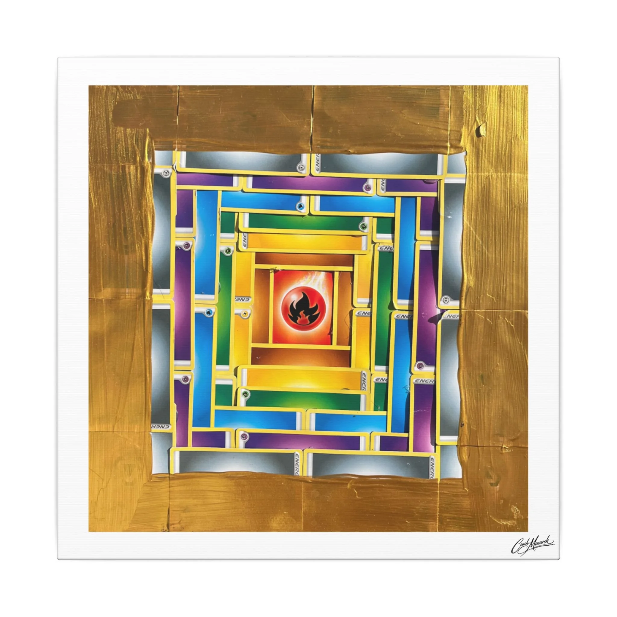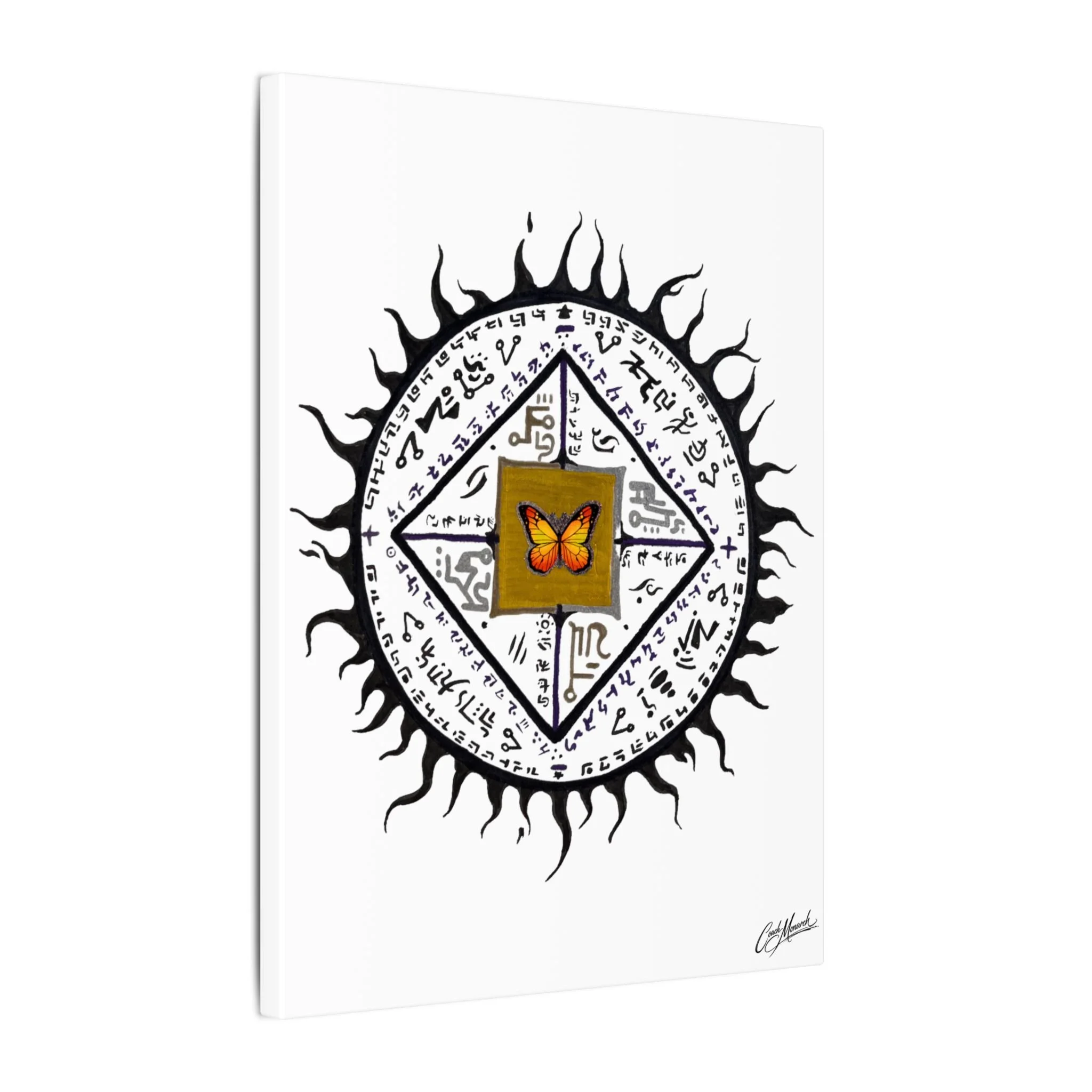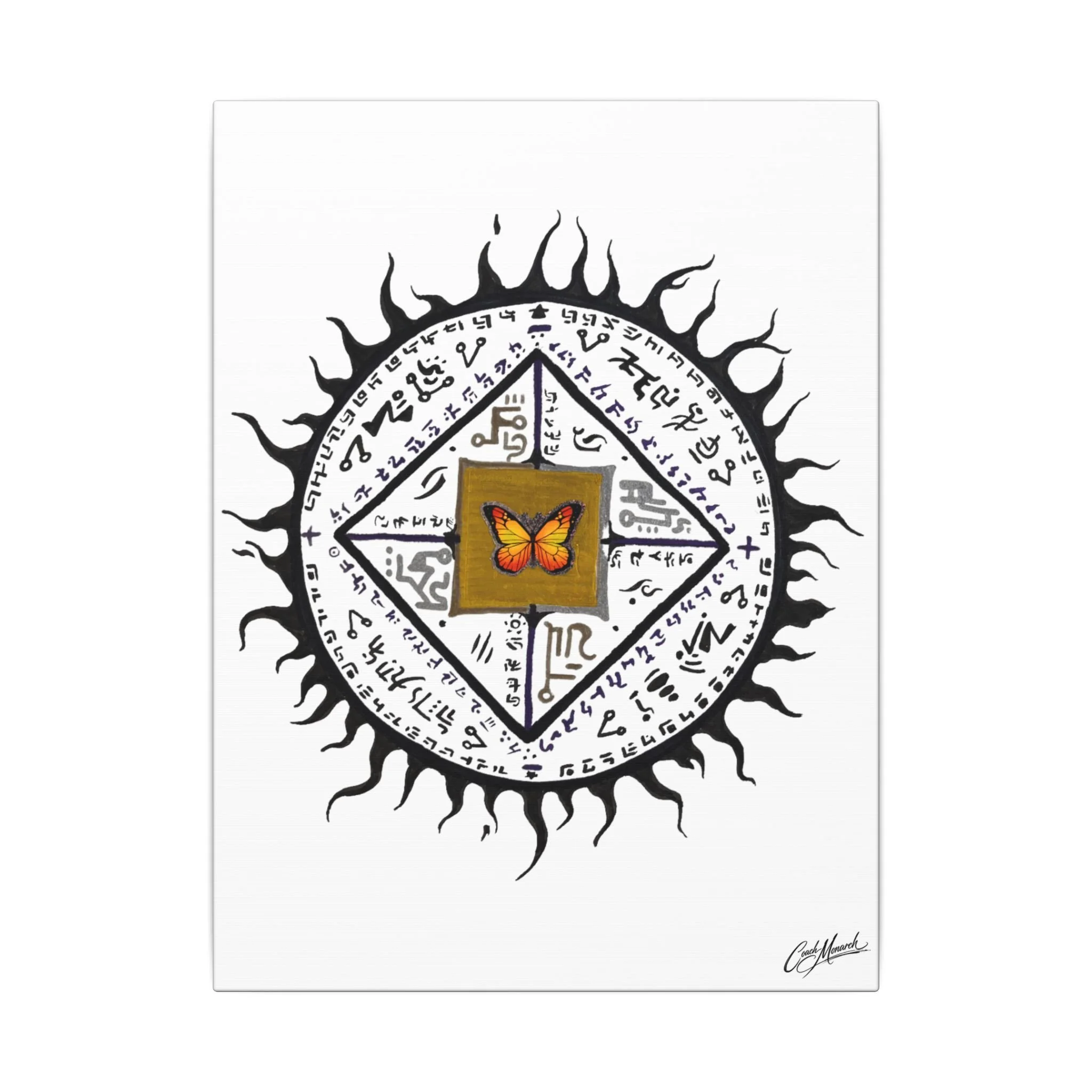 This stretched matte canvas brings together spiritual geometry and monarch symbolism in a calm, contemplative wall piece. Layers of mandala patterns are blended with the colors of the chakras, guiding the eye inward while celebrating the Monarch motif woven through each ring.